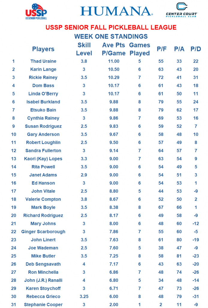 A maximum of thirty players enjoyed competing in the inaugural week of the USSP Fall Social League at Center Court Pickleball Club in Glendale Arizona, sponsored by US Senior Pickleball and Humana.